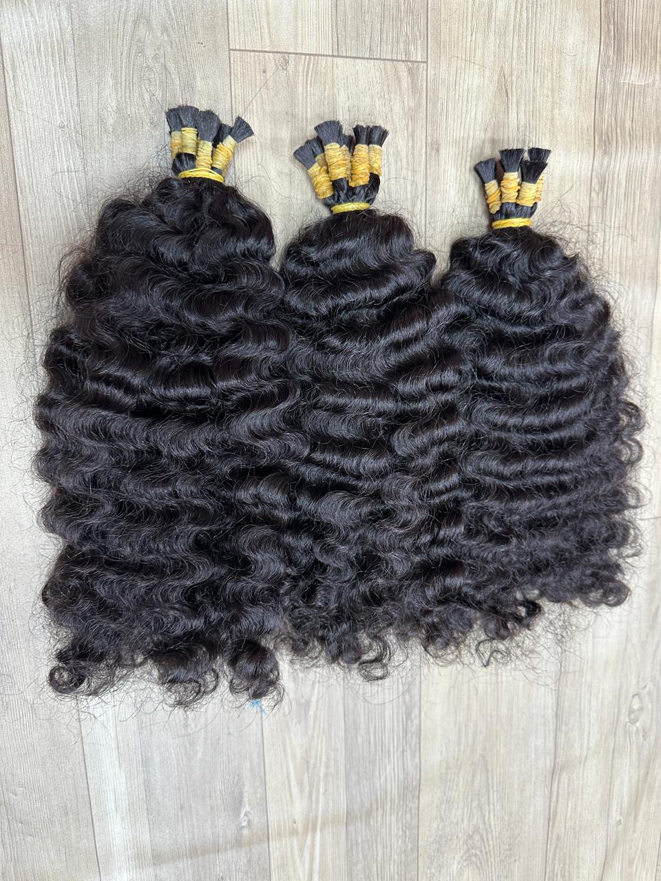 Raw Burmese curly bulk hair refers to high-quality, unprocessed hair sourced from Burma (Myanmar). It is known for its natural, tight curls and voluminous texture. The hair is cut directly from donors without any chemical treatments, preserving its strength, luster, and natural curl pattern. Burmese hair tends to be thicker and coarser than other types, which makes it ideal for those seeking a fuller, more textured look. Since it’s in bulk form, it doesn’t come wefted, making it perfect for custom wig-making, braiding, or other versatile styling options. It’s also durable and long-lasting.